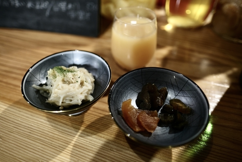 色々と美味しそうなおつまみなどもあって迷ったけれど、がっつり食べたかったので夜定食をいただきます。まずは小鉢が2品。いぶりがっこと、白いキノコのマリネ。どれもとても美味しかった!