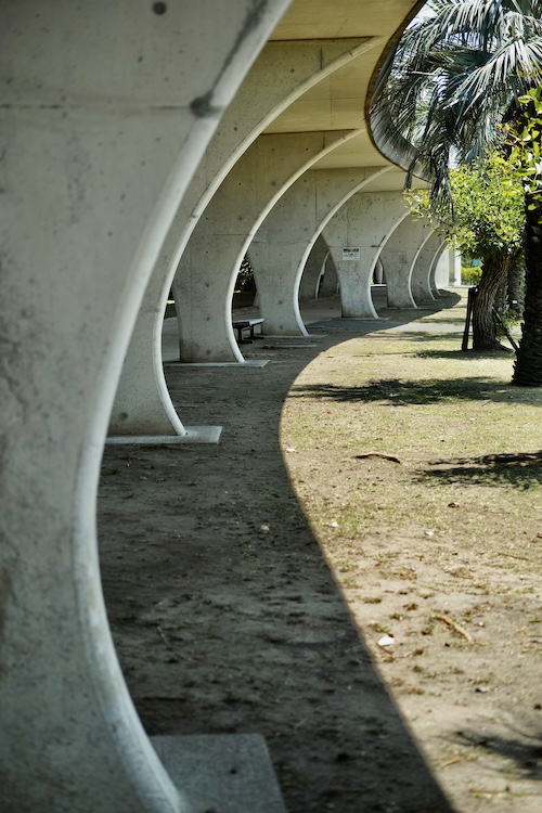 先ほど歩いた回廊の反対側にも同じような回廊があり、その先にもトイレがありました。市の施設配置図によるとそれぞれ「海の園亭」、「太陽の園亭」とちゃんと名前がついているようです。細かいコンセプト聞いてみたいよ〜。どこかに資料が落ちてないかしら・・・。