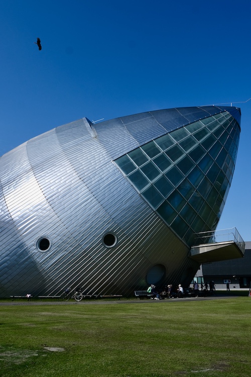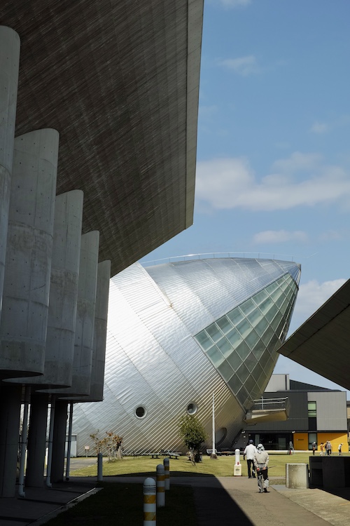 摩訶不思議建物が初夏の熱い日差しを受けて、ギラギラとメタリックな輝きを放っていました。目の前に突如現れた異様な光景ににテンションが上がります。