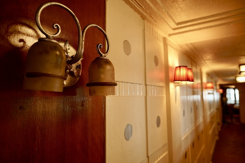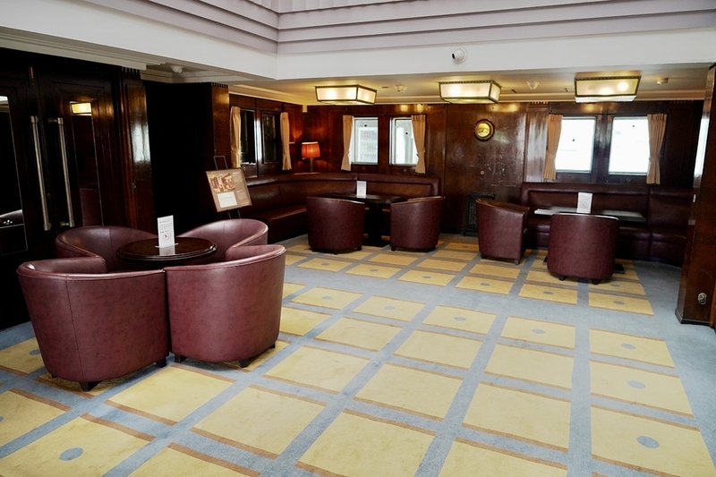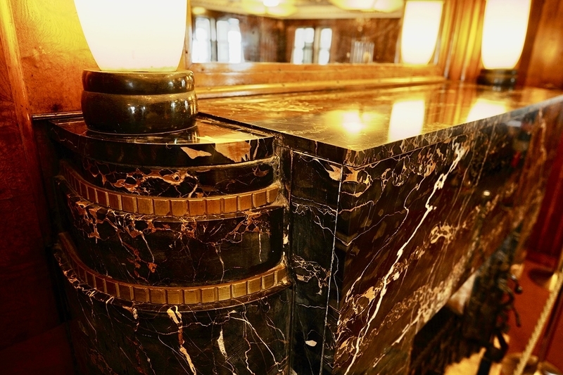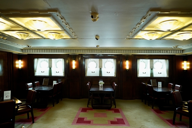 天井の照明やドア等、さまざまな箇所にアールデコの意匠が見て取れます。なんと家具も船内装飾の一部としてデザインされたオリジナル。この当時の手仕事って変態的な拘りが細部にちりばめられていて最高だよね(ほめてる)。