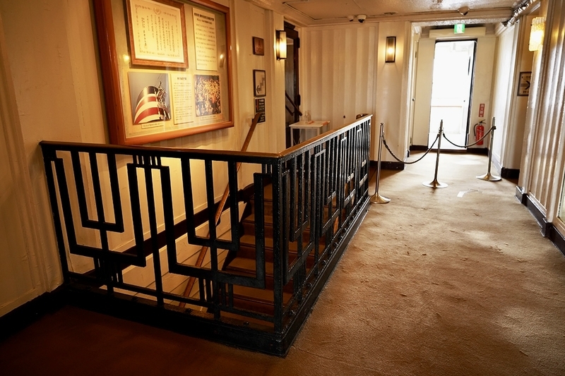 氷川丸にはその名の由来でもある氷川神社から勧請された神様が祀られています。なんと、食堂を抜けて登ってきた階段の装飾には氷川神社の神紋である「八雲」が使われています。